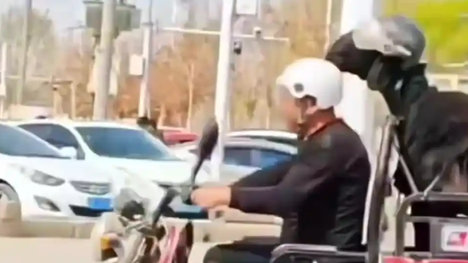 一名司机为所拉的黑羊戴上安全帽骑行,安全意识的另类示范让执勤交警哭笑不得。