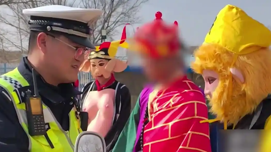 四名男子装扮成《西游记》师徒四人,驾驶贴有“经过九九八十一难”标语的农用三轮车在公路上行驶时,因违法载人被交警拦截。